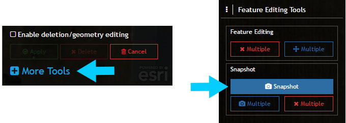 Select 'More Tools' and then select the 'Multiple' button located under the Snapshot title in the 'Feature Editing Tools' menu. This will open the 'Group Snapshot Creation' window, which offers options to filter the selected features