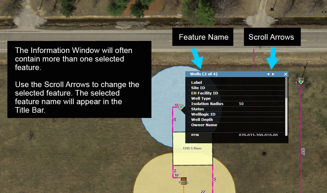 3.1 In the Title Bar of the Information Window the Name of the currently selected feature is displayed, along with the sequence (2 of 4) and Paging Arrows.