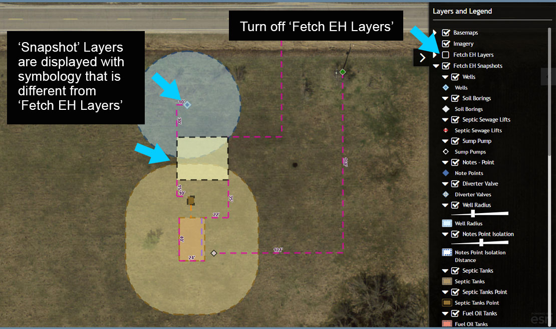 There will be times when you want to save a version of a site plan, such as mapping both preliminary site plans and finals and archiving systems. The 'Snapshot' tool is used to create an exact copy of an existing feature(s). The resulting Snapshot features are accessible as 'Snapshot Layers' and managed in the Toggle Layers under the 'Fetch EH Snapshots' layer group.